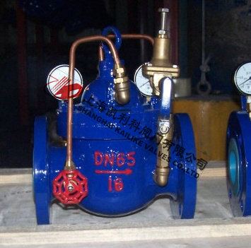 900X消防緊急關閉閥當出口壓力低于導閥設定的壓力時,導閥此時處于開通狀態,主閥上腔壓力與主閥出口壓力相等,進口與吃口存在壓差,水流經閥口出口流出,當消防泵氣泵時,或變平泵壓力升高時,超過導閥設定壓力,由主閥進口向導閥管控制室壓力升高,作用在彈簧壓力增大,向下壓緊,帶動閥芯下移,使導閥關閉,此時主閥進口壓力通過節流閥補充到主閥閥蓋上腔,因閥瓣受到向下壓力大于向上推力,主閥關閉。值得注意的是,進口壓力小于設定壓力是,主閥處于開啟狀態,進口壓力大于設定壓力,閥瓣關閉。